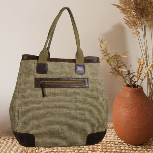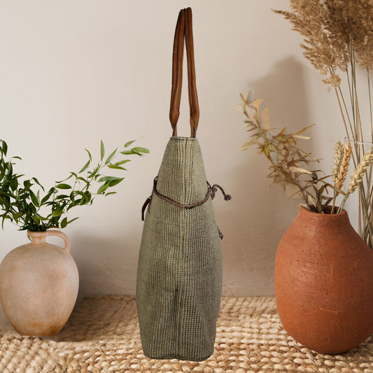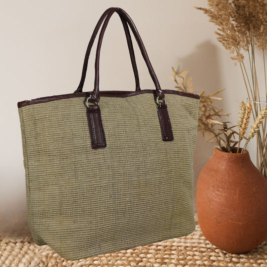 Large Jute Handbag with Leather Pocket & Handles – Eco-Friendly Everyday Tote
