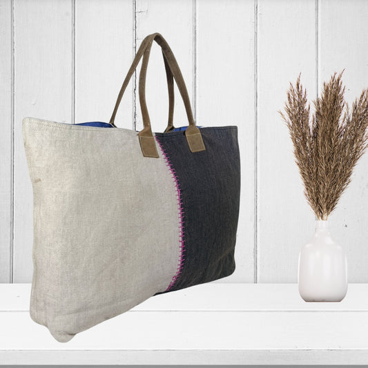 Large Linen Handbag with Wide Stripe Back – Modern Classic Everyday Tote