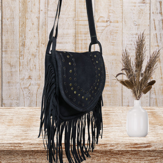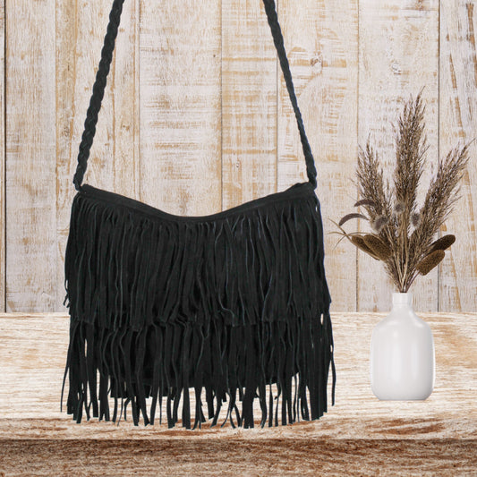Black Suede Crossbody Leather Bag with Fringes