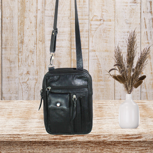 Black Crossbody Leather Bag with Adjustable Strap"