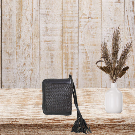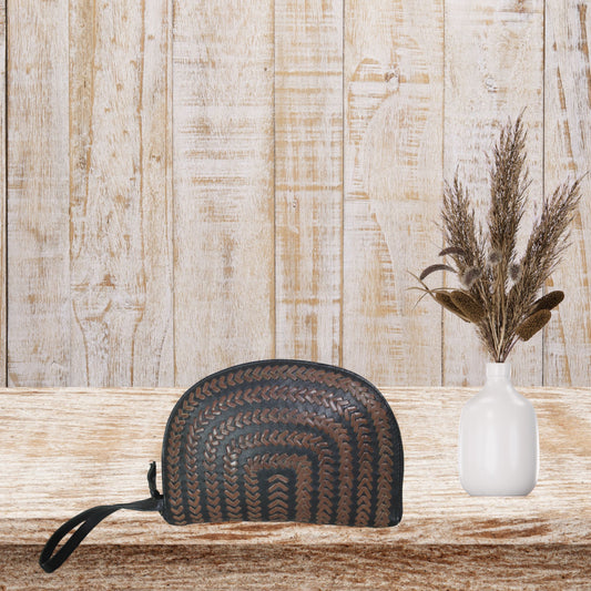 Black & Brown Leather Wristlet Pouch With Braid Weaving
