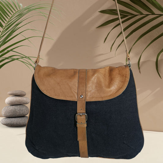 Classic Jute Satchel Bag with Genuine Leather Flap