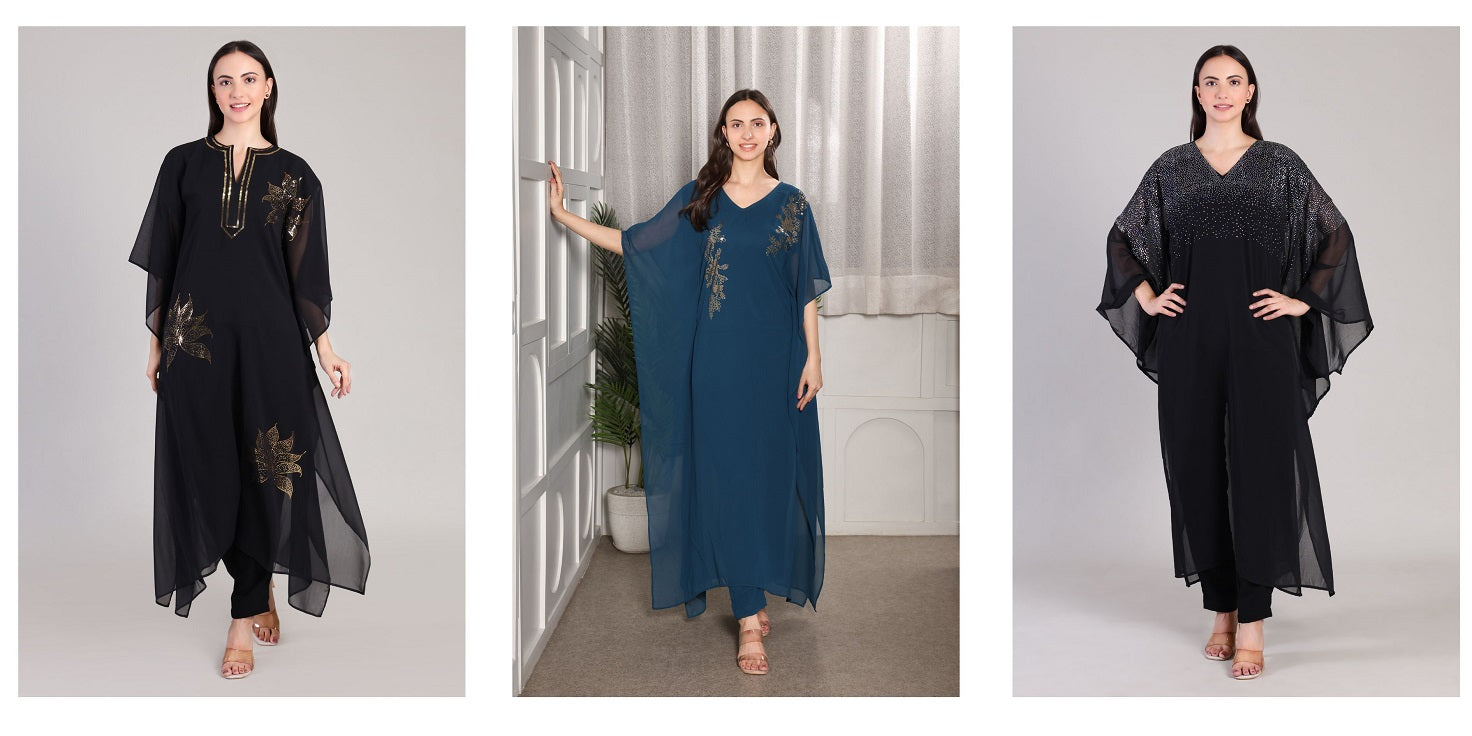 ✨ Peacock Feather Sequin Motifs Georgette Tunic & Pant Set for Women