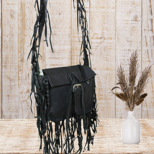 Black Leather Fringes Bag
